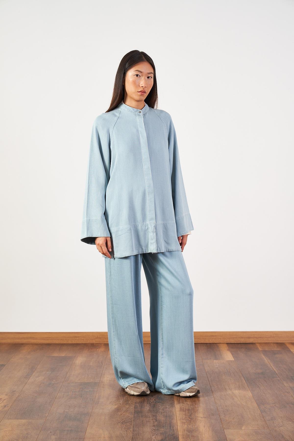 Üst kısmında yer alan kontrast bej gömlek yaka detayı, klasik denim tonuna zarif bir dokunuş katıyor. Düğmeli tunik formu, rahat kesimiyle birlikte özgür hareket imkânı sağlar. Alt parçada yer alan lastikli bel pantolon, hem pratik hem de konforlu bir kullanım sunar. Bol paça yapısı vücut hatlarını belli etmeden zarif bir duruş kazandırır.