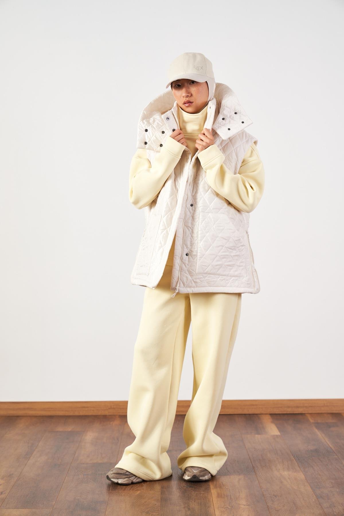 Geniş Kalıp Kapitone Şişme Kadın Yelek Ekru