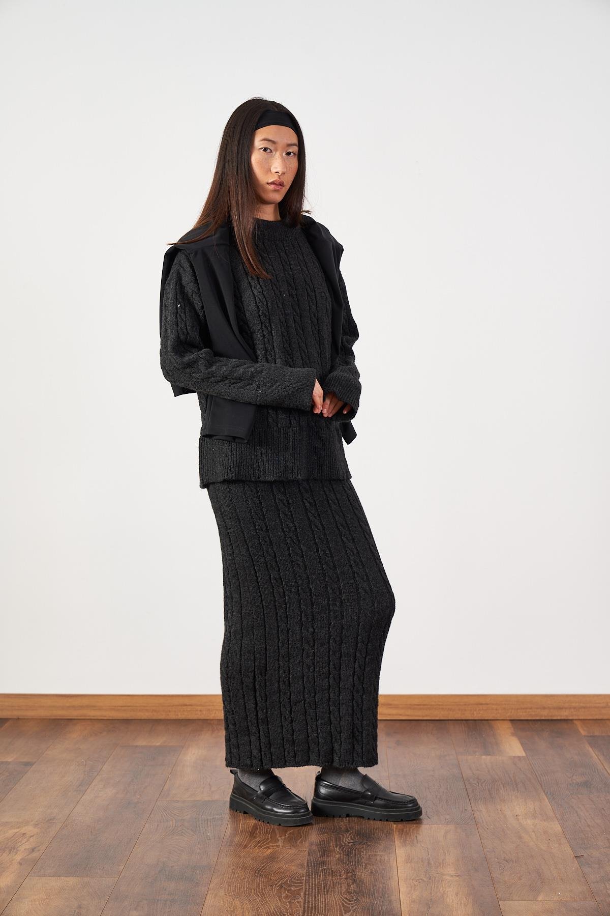 Saç Örgü Oversize Kazak Uzun Etek Triko Takımı Antrasit