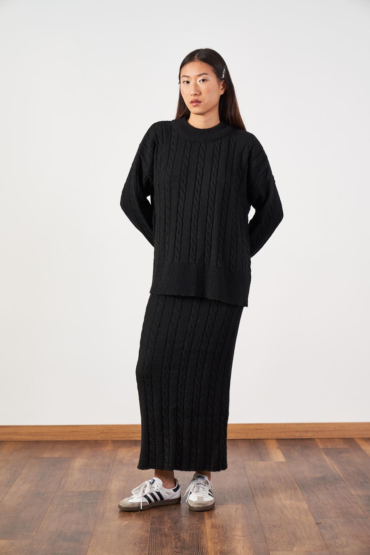 Saç Örgü Oversize Kazak Uzun Etek Triko Takımı Siyah