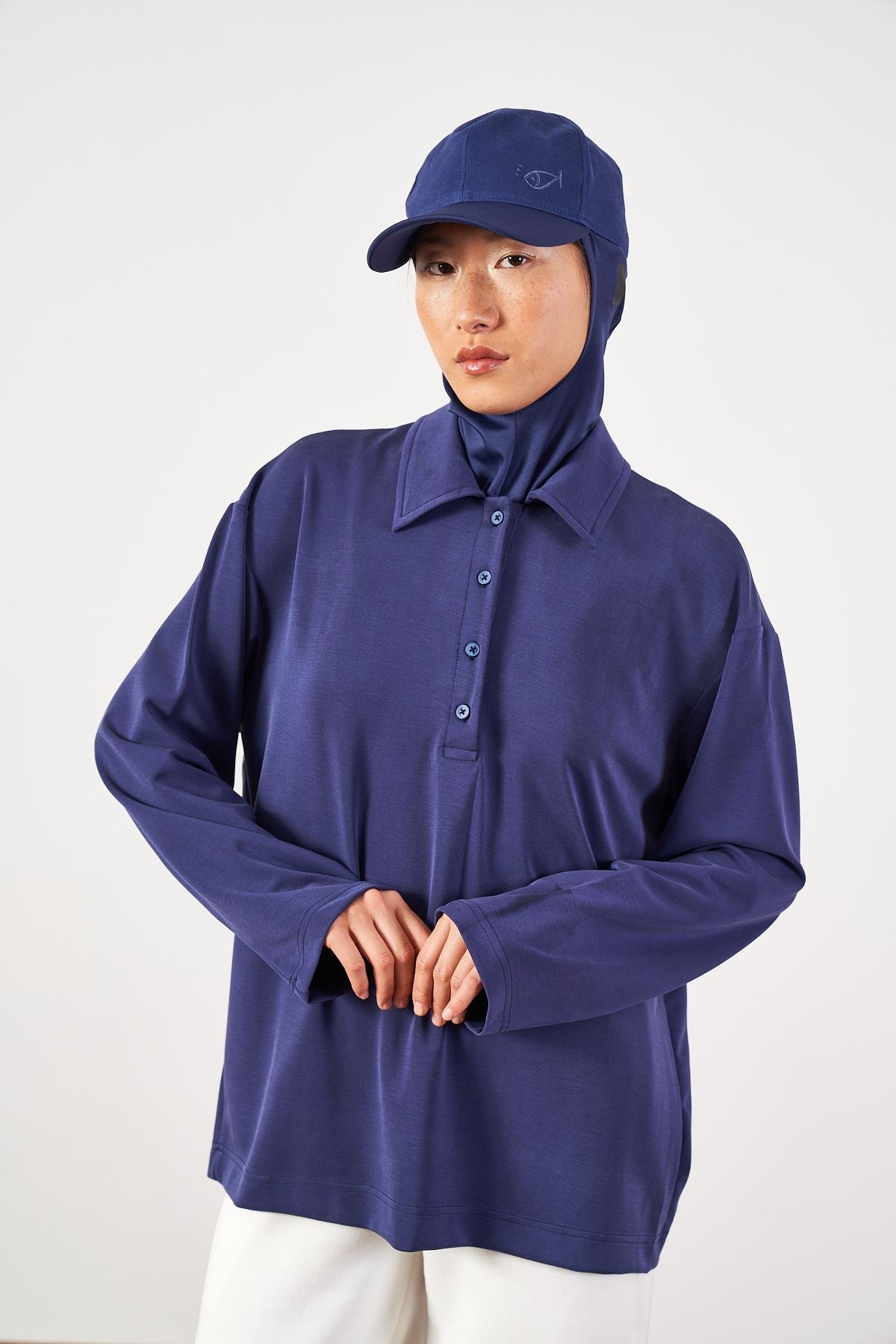 Kadın Sportif Polo Yaka Düğmeli Tişört, tesettür giyimde sade şıklığı ve konforu bir araya getirir. Günlük hayatta, yürüyüşte veya seyahatte tarzınızı zarif bir şekilde yansıtın!