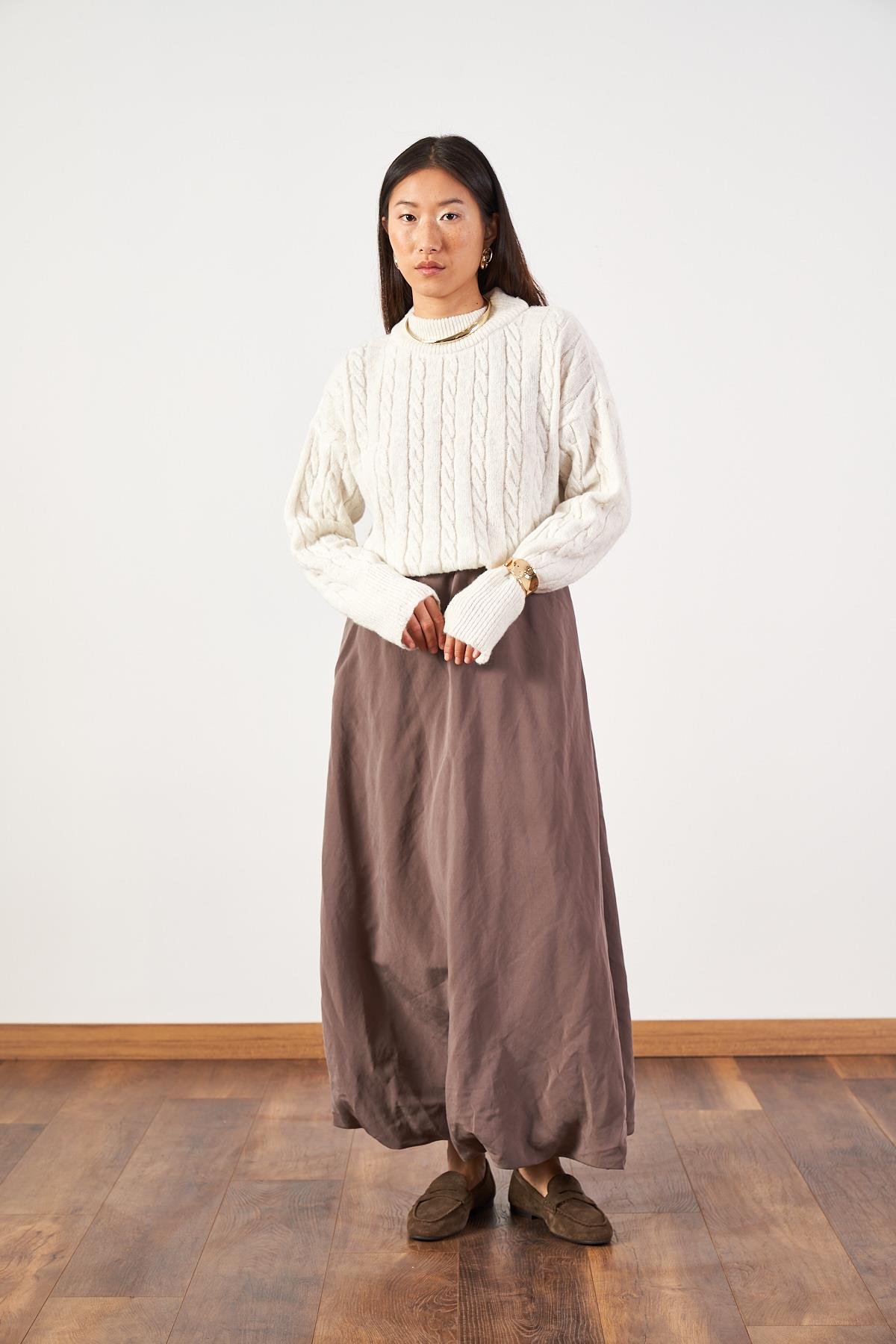 Ekru uzun balon eteği beyaz boğazlı triko kazak ve sade eşarp ile kombinleyerek minimal bir zarafet yakalayabilirsiniz. Günlük tarz için spor ayakkabılarla, şık bir görünüm için topuklu ayakkabılarla tamamlayabilirsiniz.